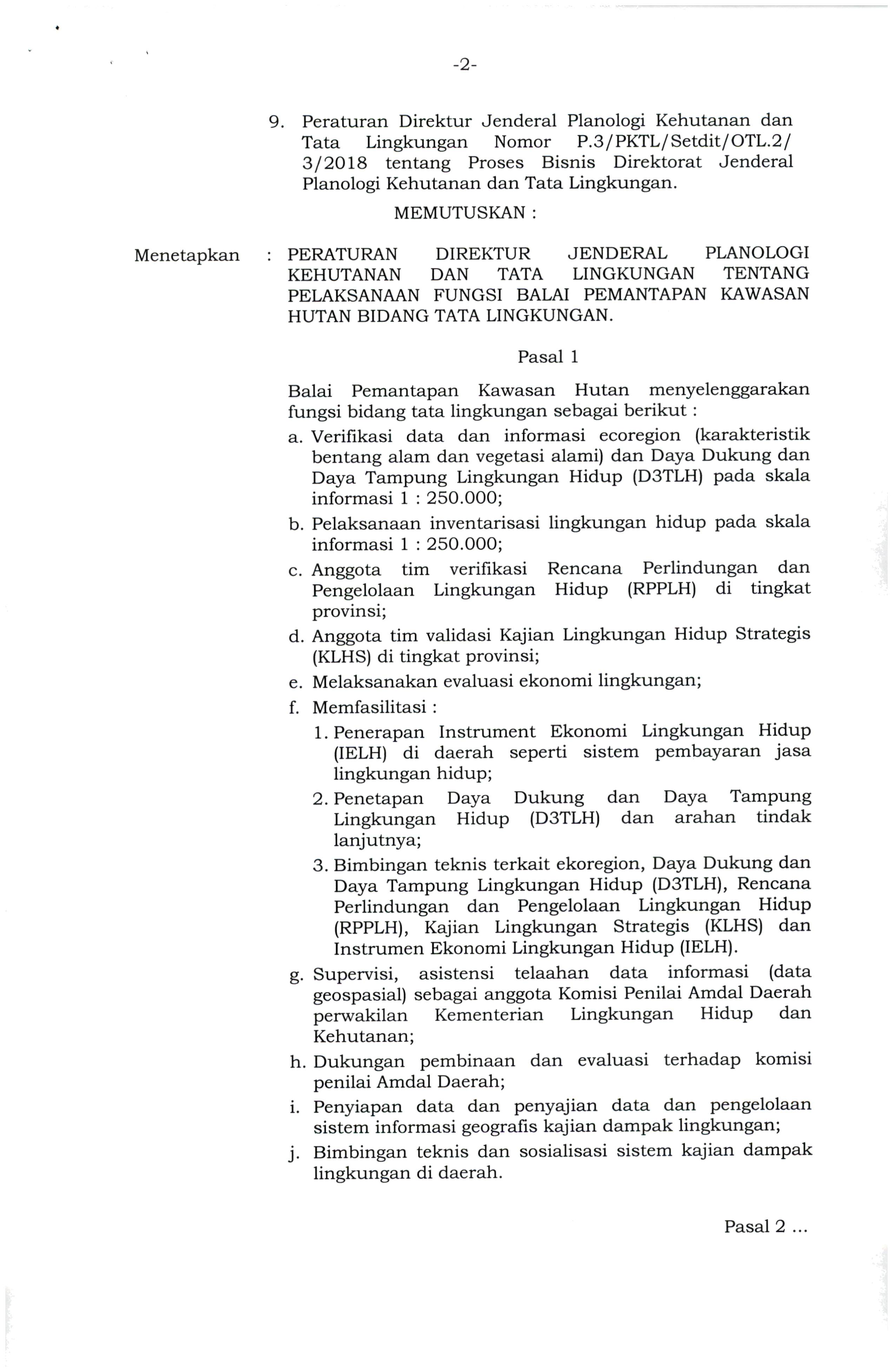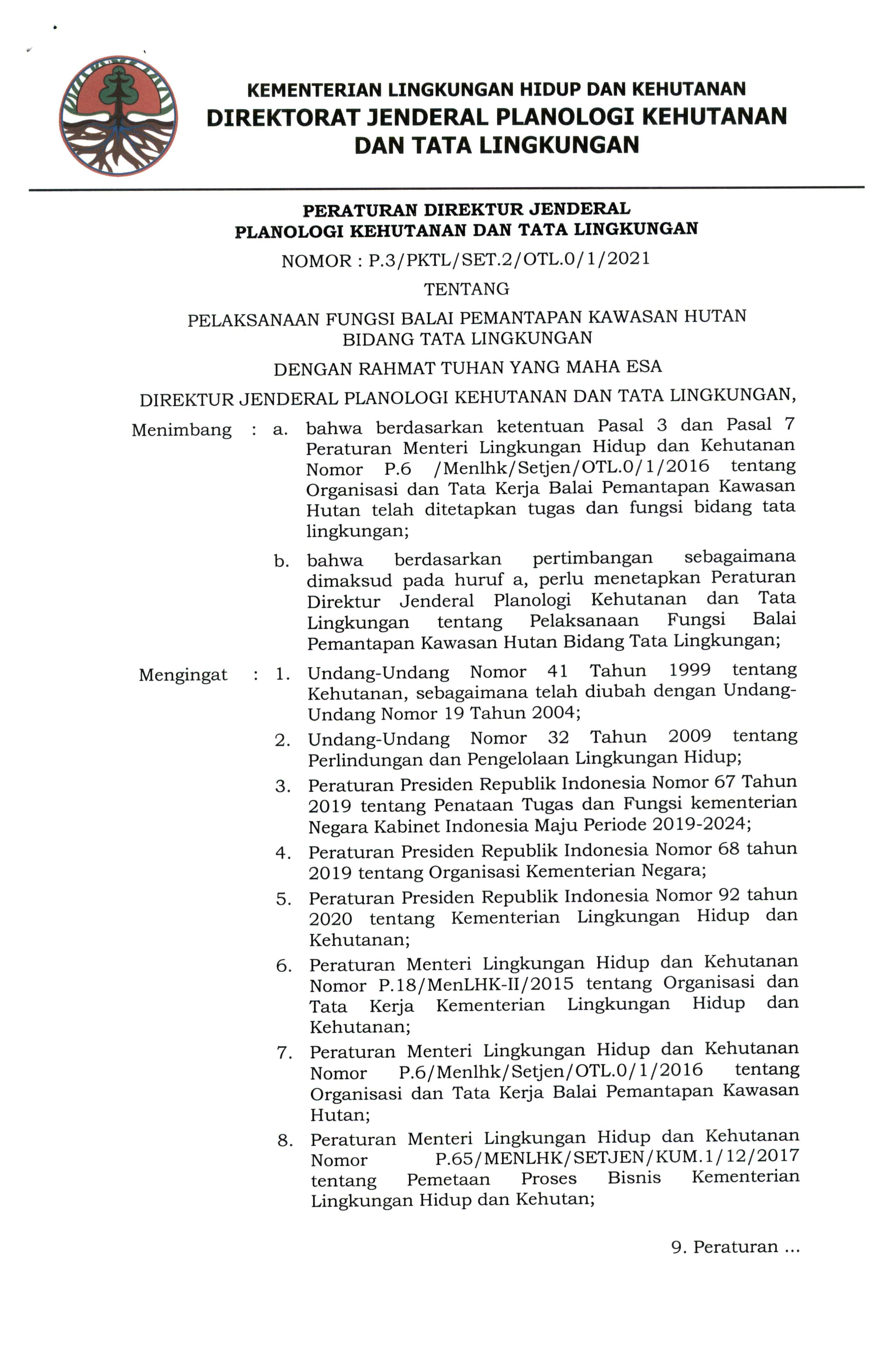 PERATURAN DIREKTUR JENDERAL PLANOLOGI KEHUTANAN DAN TATA LINGKUNGAN NOMOR : P.3/ PKTL/ SET.2 / 0TL.O/ 1/2021 TENTANG PELAKSANAAN FUNGSI BALAI PEMANTAPAN KAWASAN HUTAN BIDANG TATA LINGKUNGAN